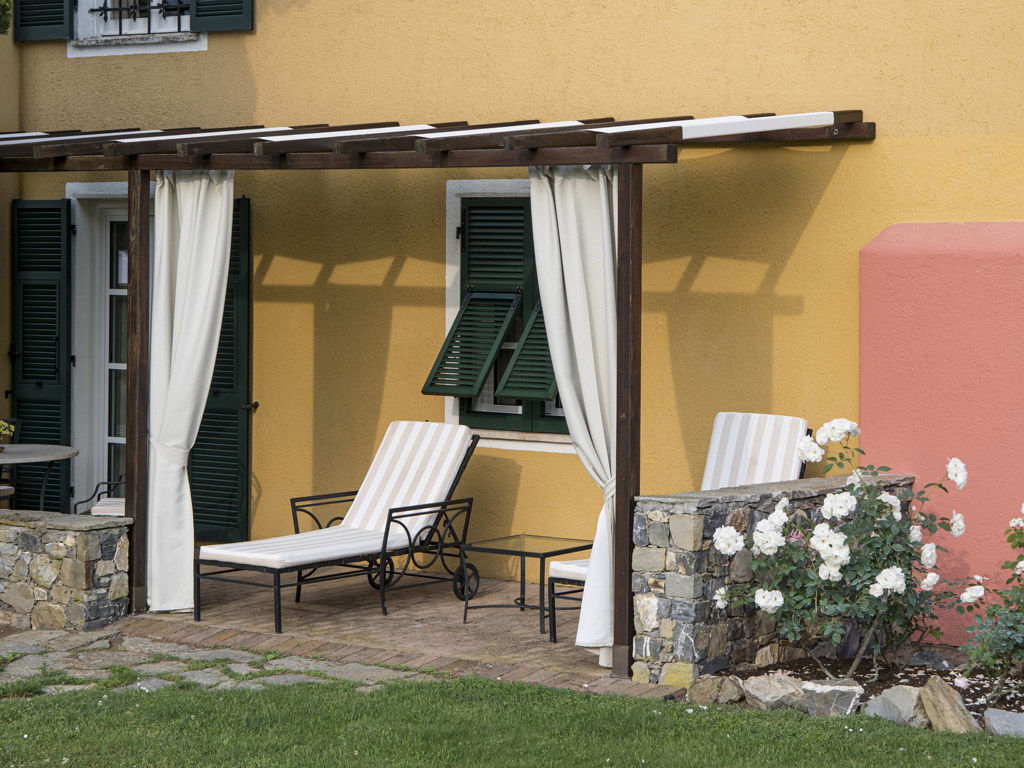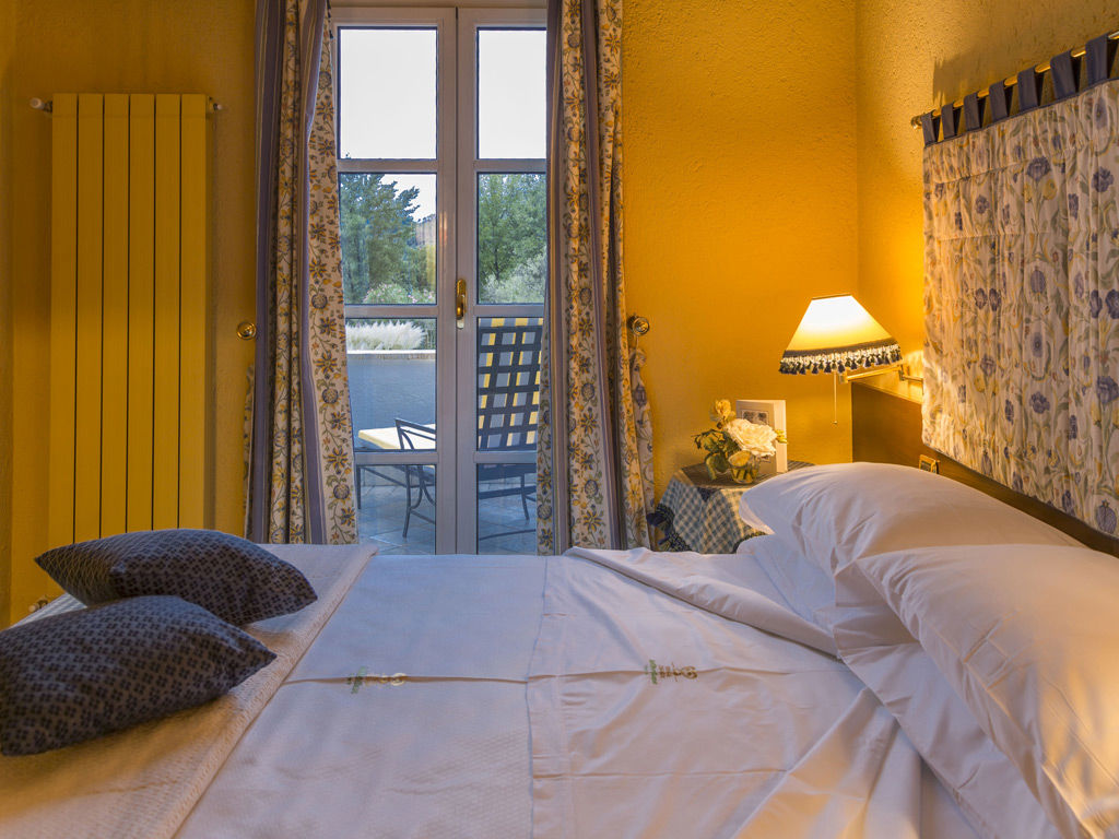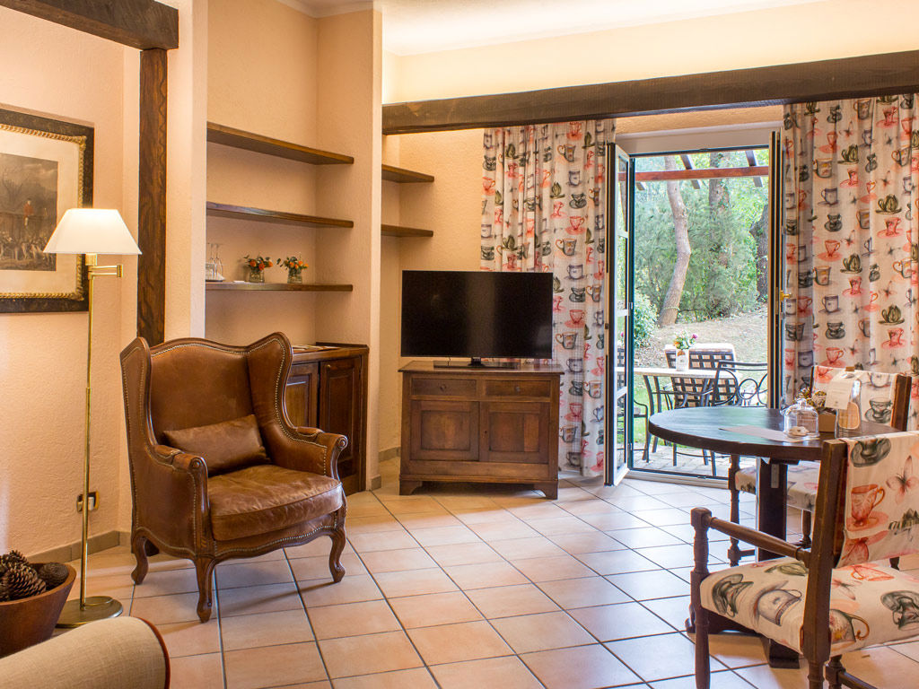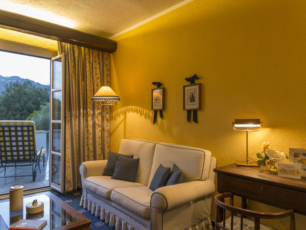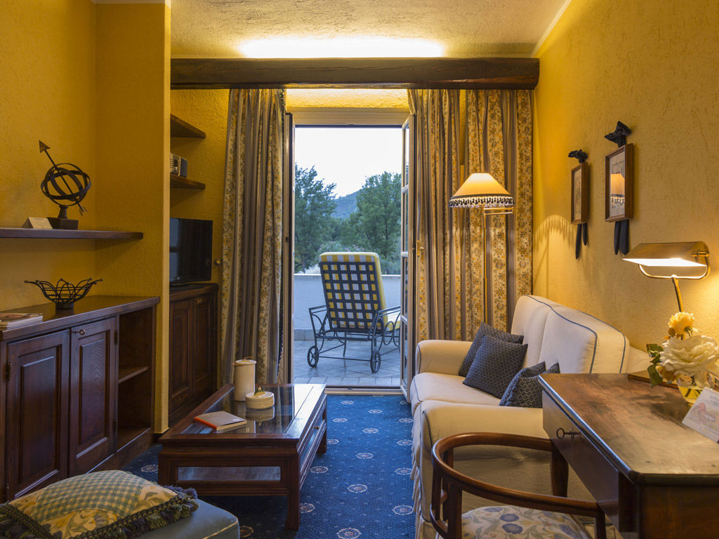 Les Suites Junior Terrasse disposent d'une chambre avec lit matrimonial et un coin salon. La grande terrasse située au-dessus du hall d'entrée offre une vue magnifique sur la piscine et le jardin et est équipée de deux chaises longues et d'un parasol.