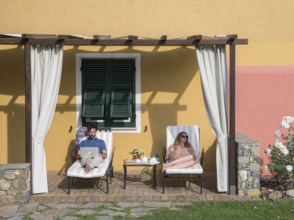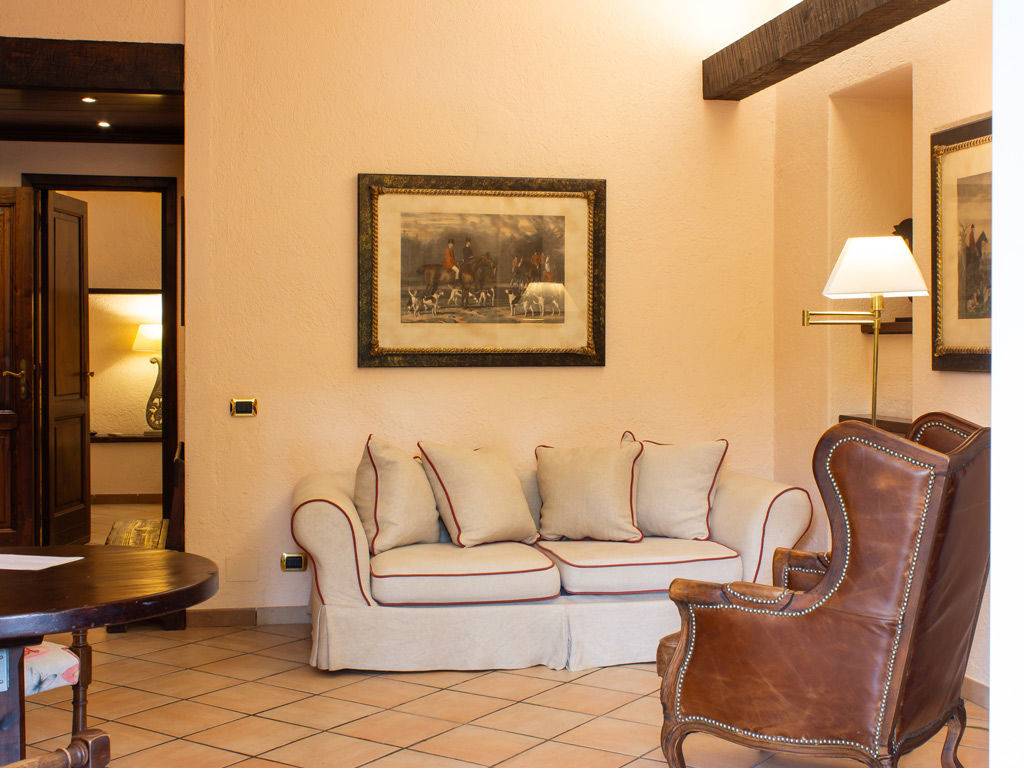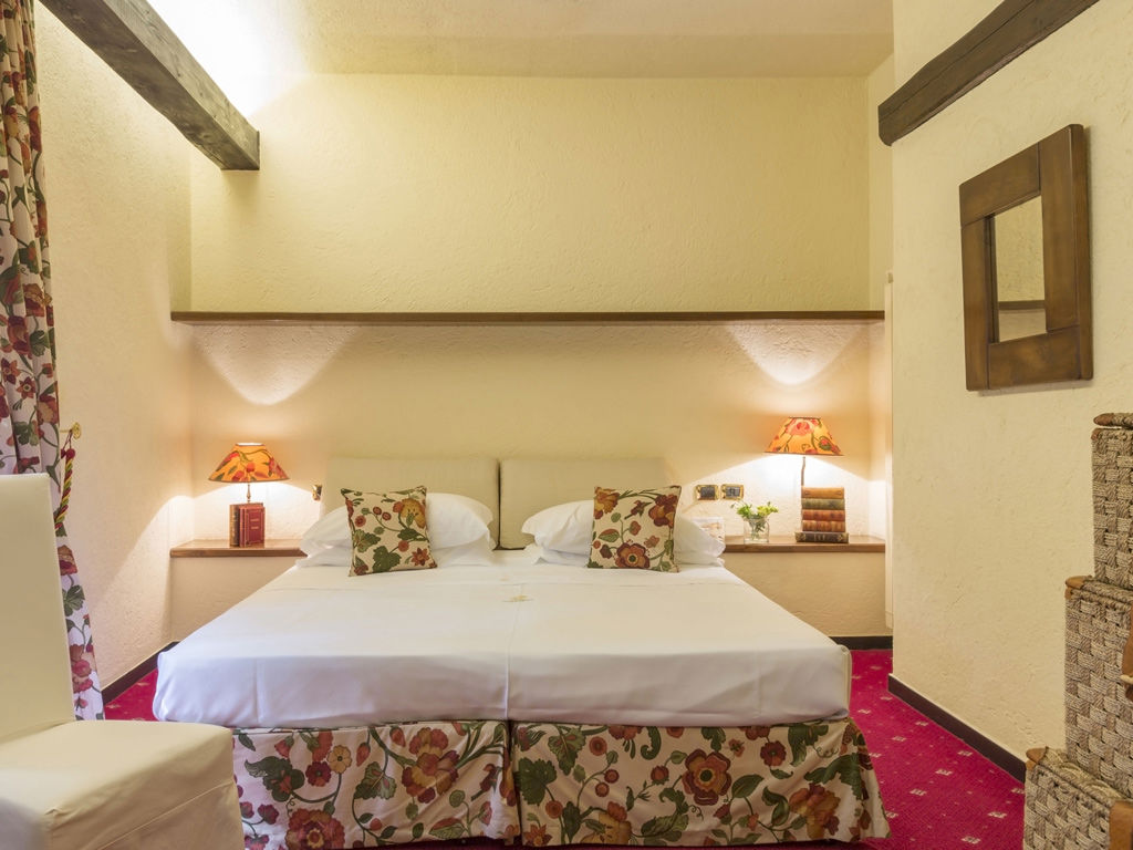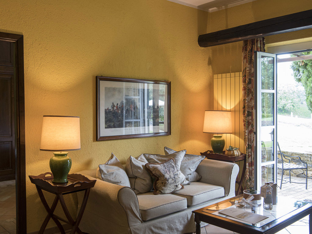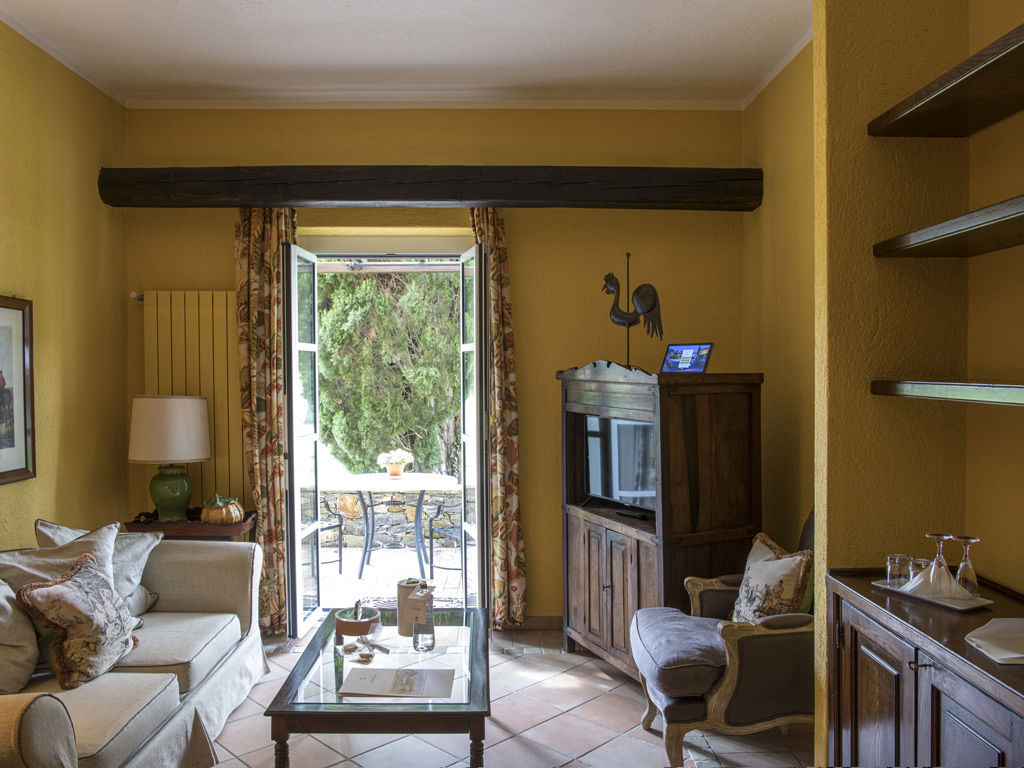 Les Suites Junior Terrasse disposent d'une chambre avec lit matrimonial et un coin salon. La grande terrasse située au-dessus du hall d'entrée offre une vue magnifique sur la piscine et le jardin et est équipée de deux chaises longues et d'un parasol.